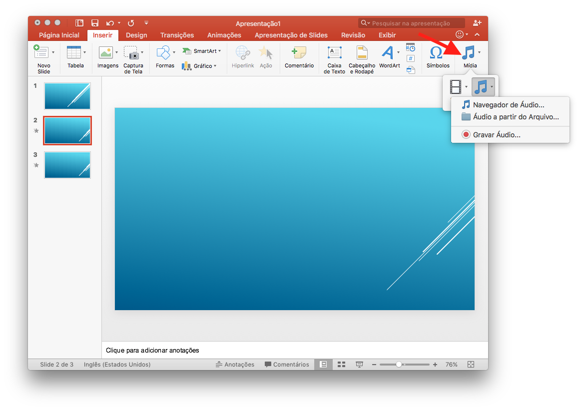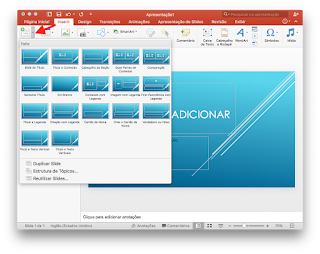 Para inserir texto clique na aba Página Inicial, na opção Inserir e em seguida Caixa de Texto. Com o botão direito do mouse, selecione o espaço do slide que pretende inserir conteúdo. Cuidado com texto muitos longos, o ideal é utilizar slides apenas como guia durante a apresentação.