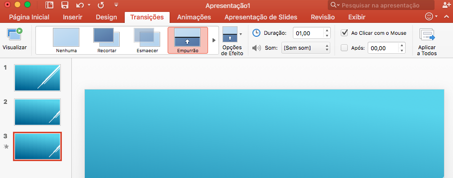 No PowerPoint você consegue adicionar efeitos de animação entre as transições de slides, para isso deve selecionar o slide desejado, clicando nele. Clique na aba Transições, e na caixa de ferramentas escolha o efeito de sua preferência, posteriormente clique em Opções de efeito para personalizar a animação.